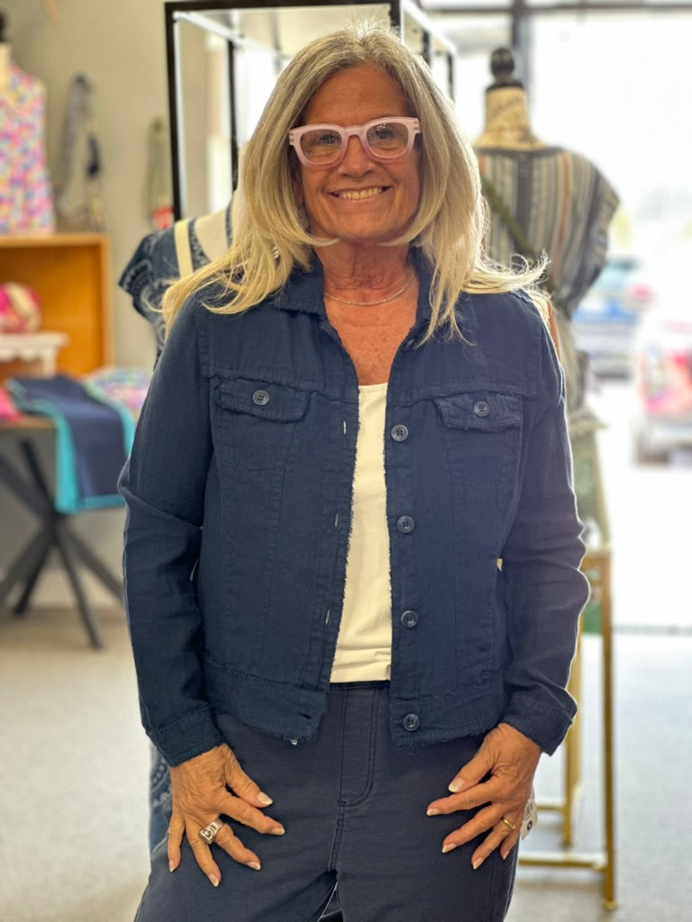 This is the perfect lightweight button down jacket with front pockets and a button at the sleeve. A durable linen jacket that fun, colorful and goes with anything in your wardrobe. It also moves with your body and if it gets wrinkled it still looks great.