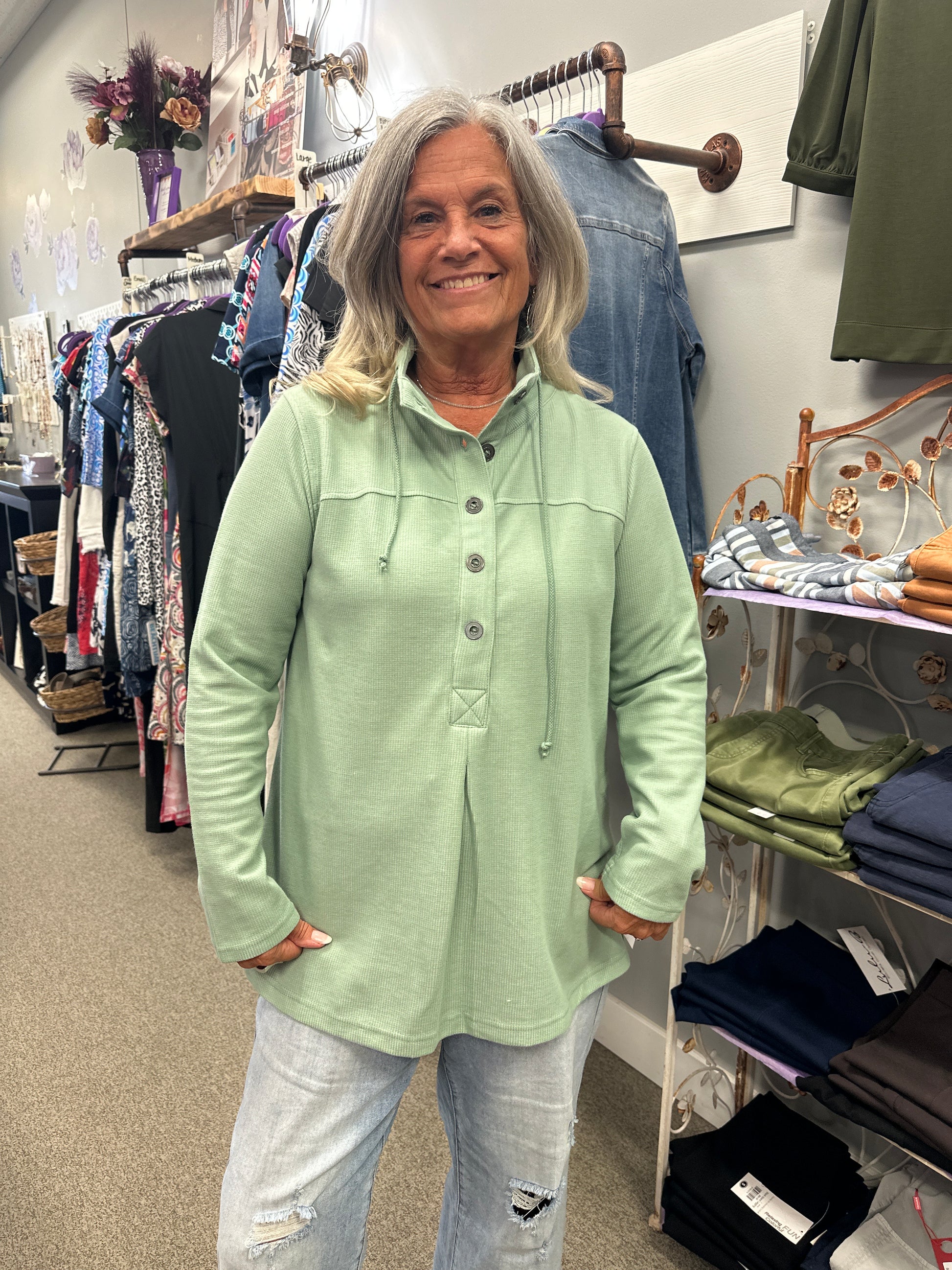 The perfect hip length comfy sweatshirt with 5 button detail, small front pleat in a beautiful sage color. Wear running errands, hanging out with friends or keeping you cozy at night.