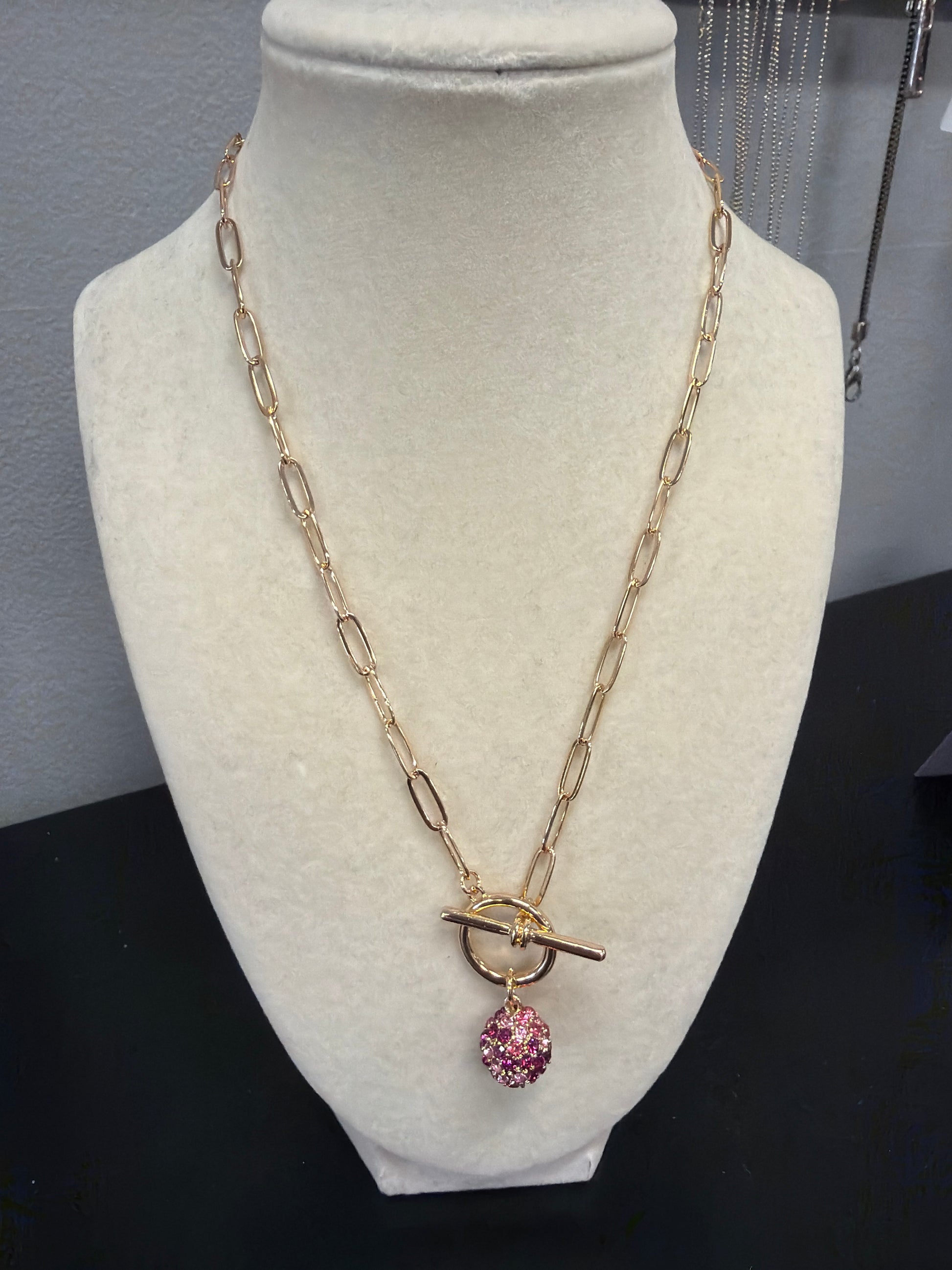 - Finish: Gold-tone links with a pink crystal ball pendant
