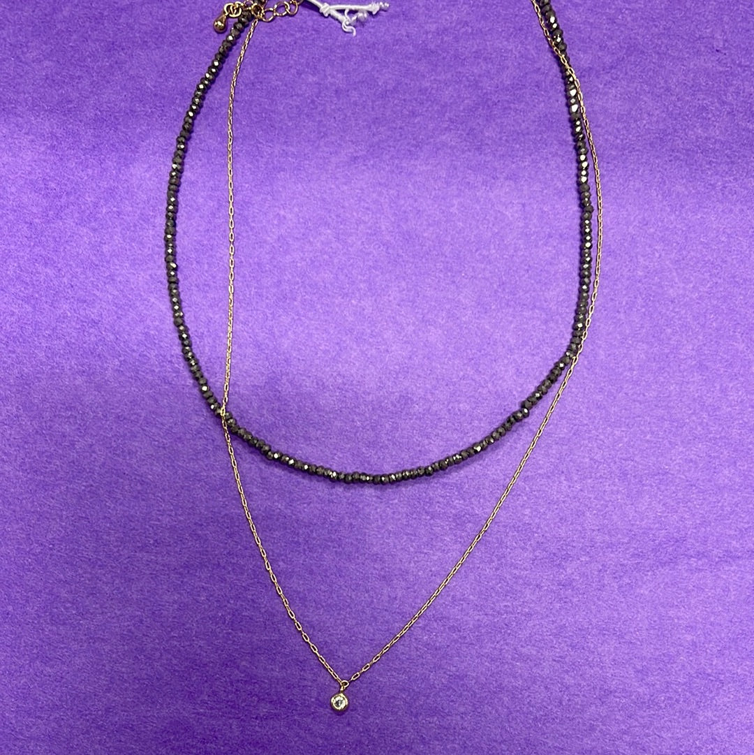 The perfect adjustable double strand hematite crystal and gold necklace with crystal pendant.