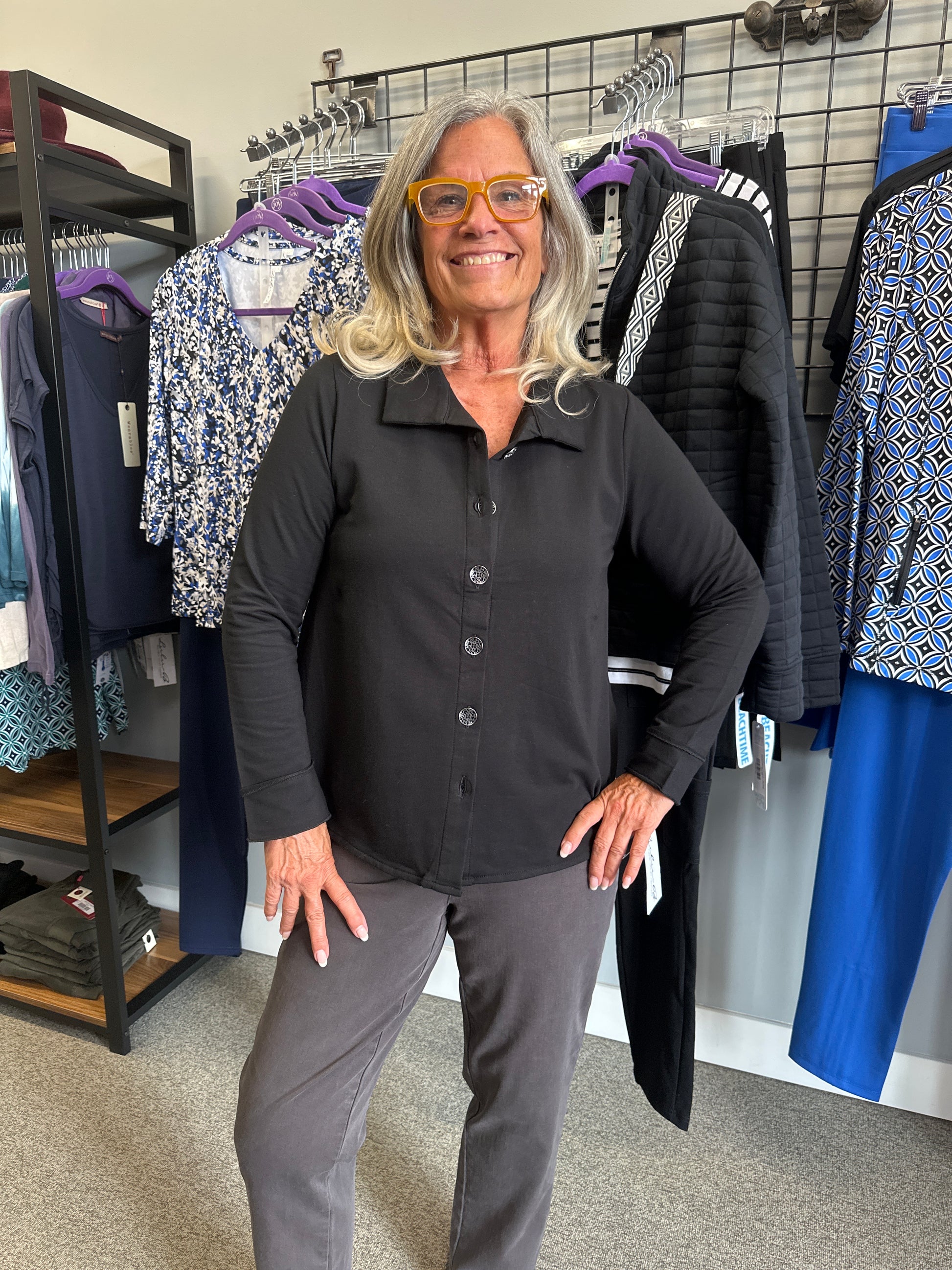 Beautiful hi-low hem button down long sleeve jacket/top with button detail on the back. The buttons have a cool design and this will go with anything in your wardrobe. Wear it on its own or over a top or dress.
