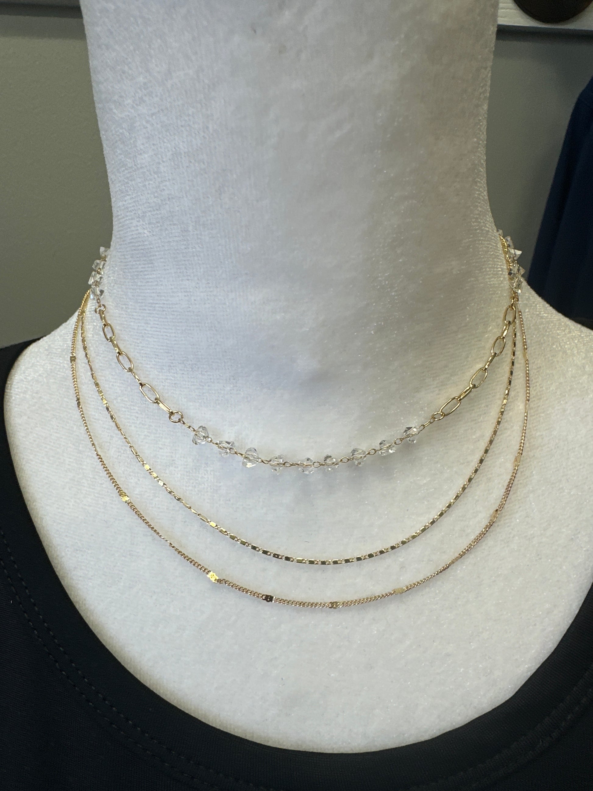 3 layered gold chain necklace with crystals make this the perfect day or night piece of jewelry.