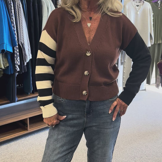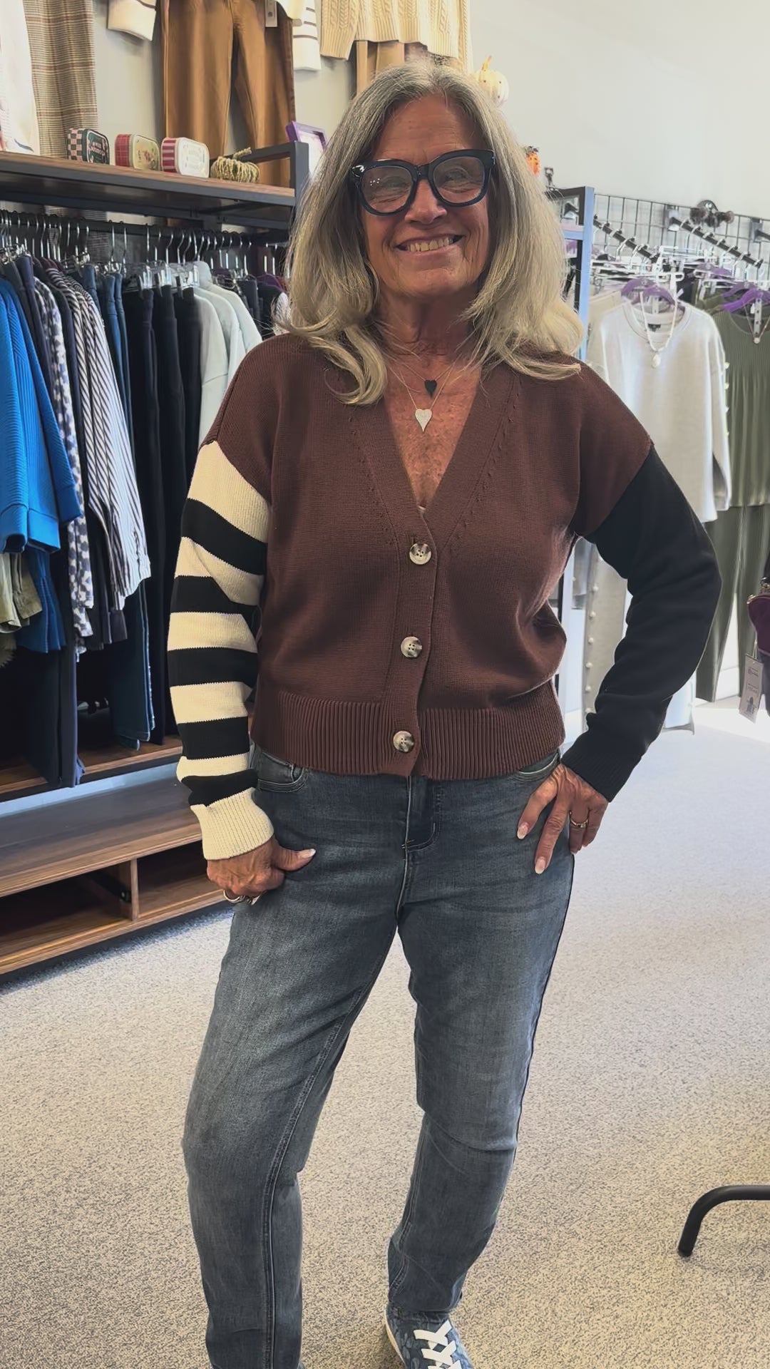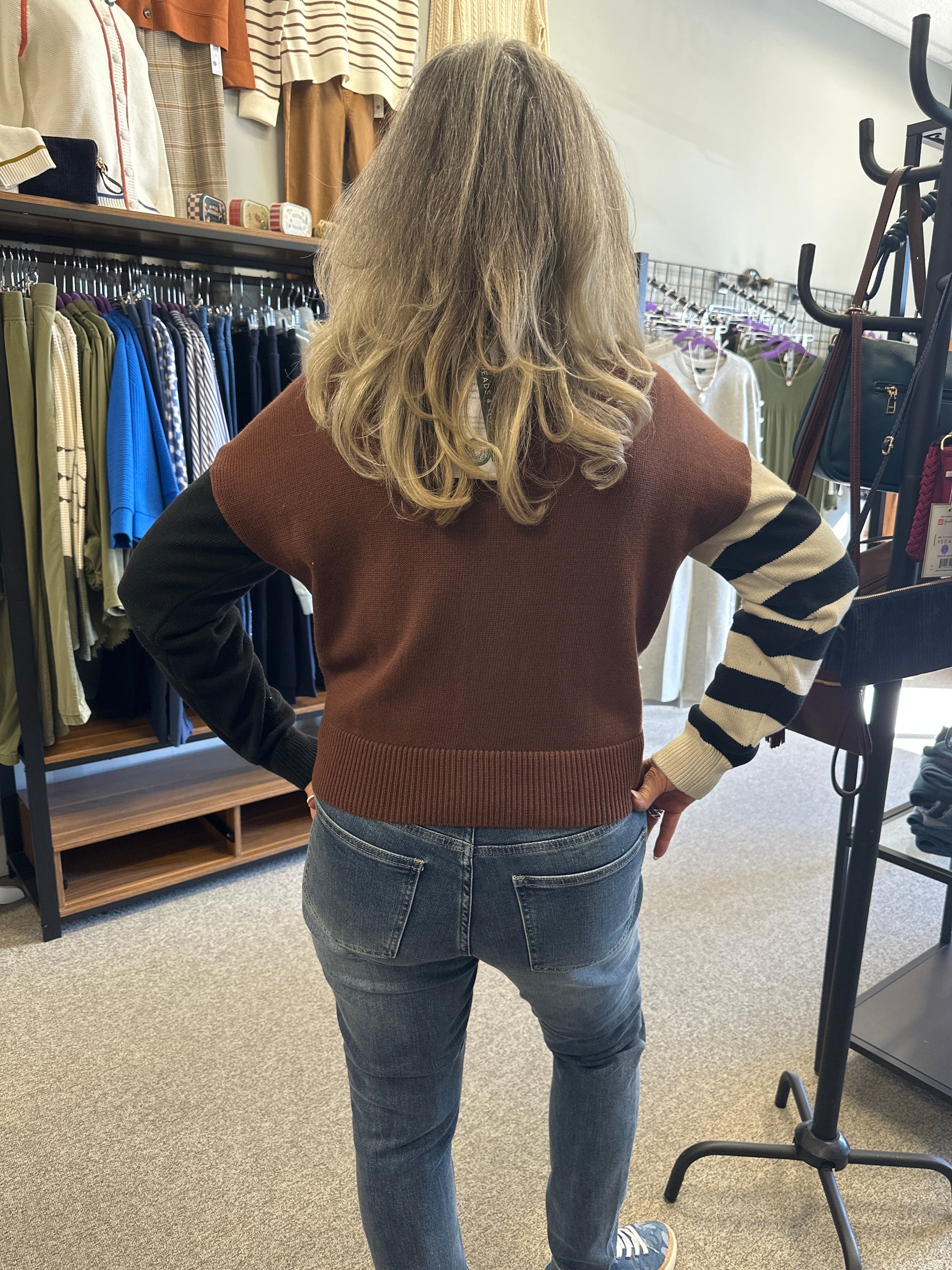 V-neck color block short waisted sweater with different sleeves to spice up the look. Adorable for day or night.