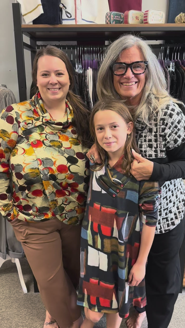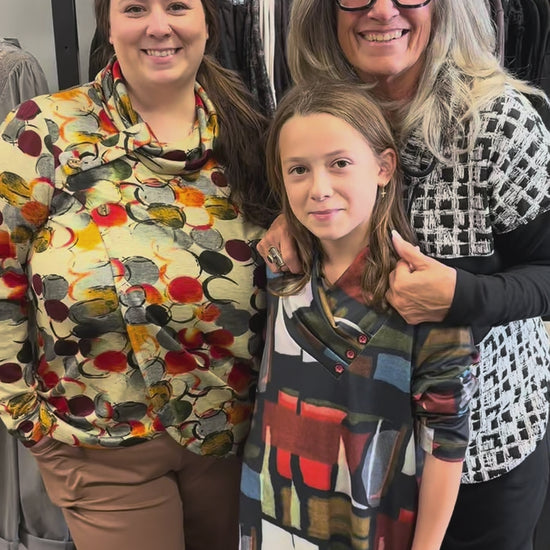 Colorful tunic in an array of brown tone colors, with long sleeves, mock neck, button detail and side overlay.