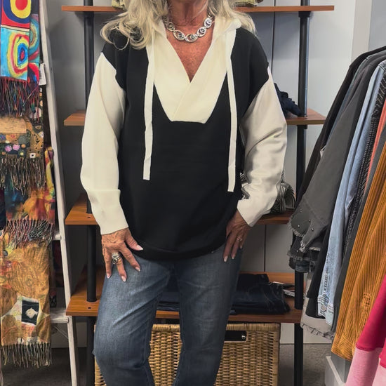 This is a colorable hoodie-style knit top featuring a relaxed, sporty design. Designed in black and ivory for a bold contrast look, this hoodie top offers comfortable layering for casual outings, travel, or athleisure-inspired styling.