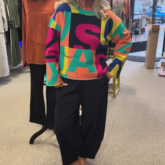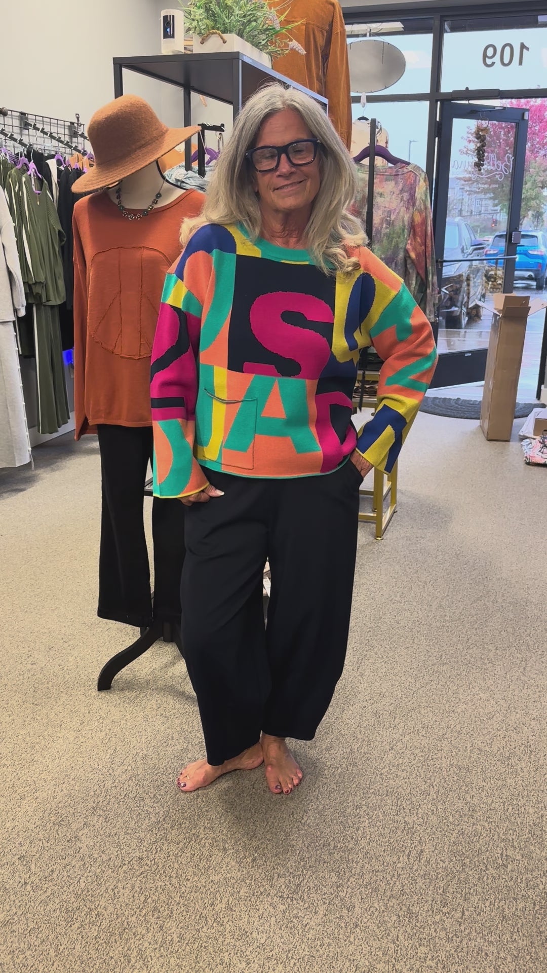 Colorful fun long sleeve sweater with one pocket. This can be worn casually, dressed up or with anything in your wardrobe.