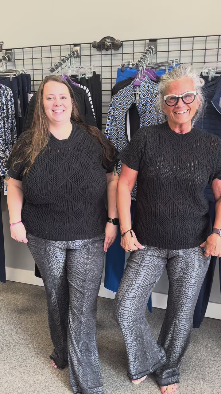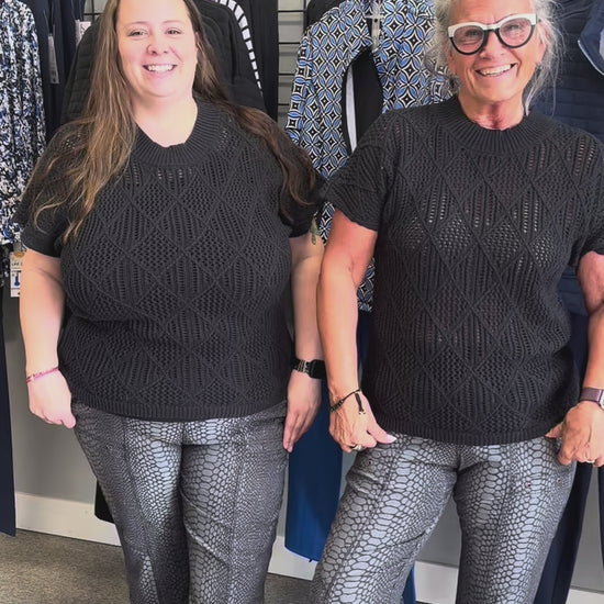 Diamond-knit cotton graces this short-sleeve mock-neck top. She's a sweater with the endless possibilities of a tee---all in one swell package! Preshrunk & machine washable.