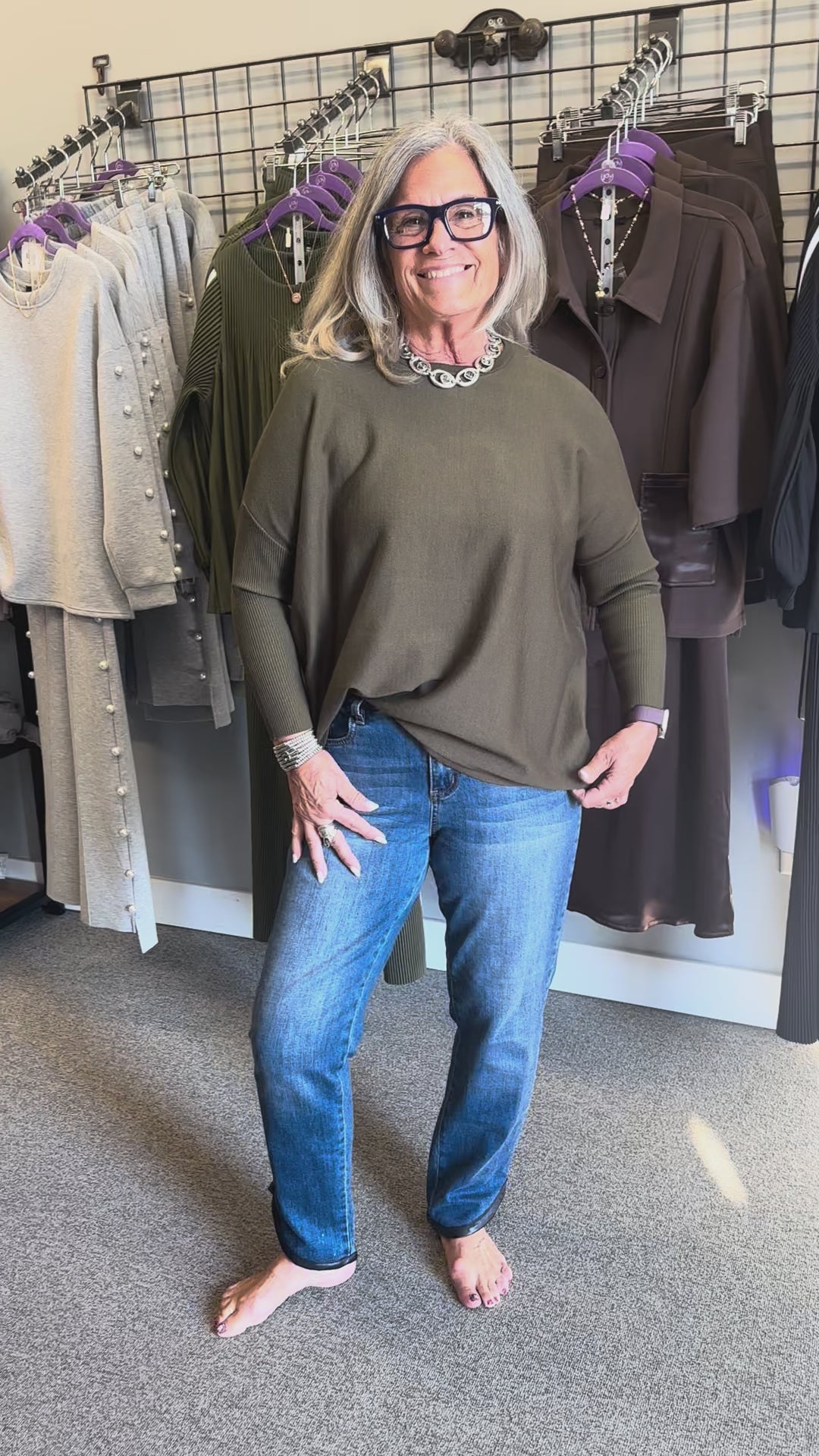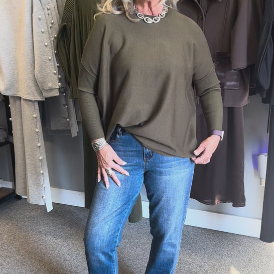 Another great fit, color and feel to this fabric. This lightweight oversized sweater has a ribbed 3/4 sleeve and round neck It will be perfect on its own or under a jacket.