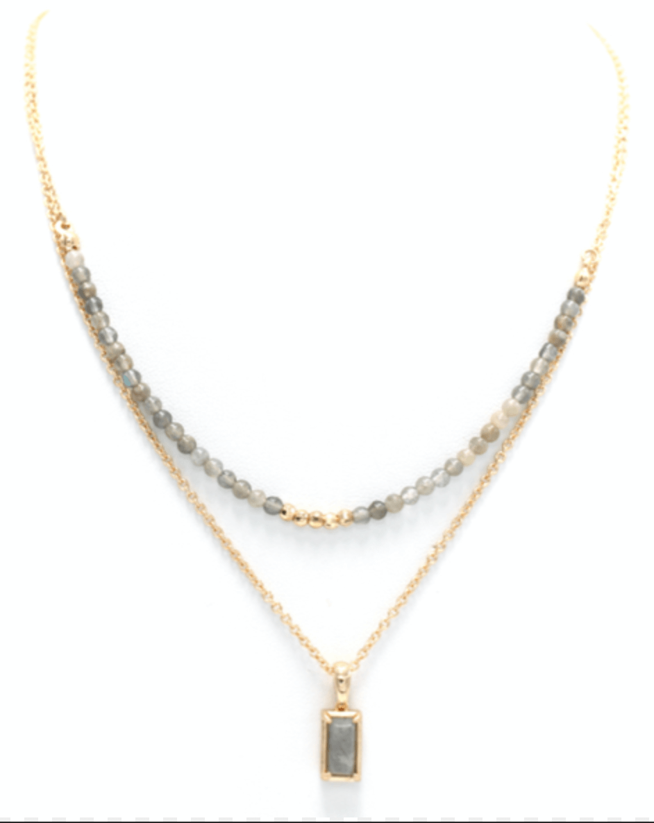 This gold double chain necklace has labradorite beads and a small chip within the pendant. We love the layered necklace look!