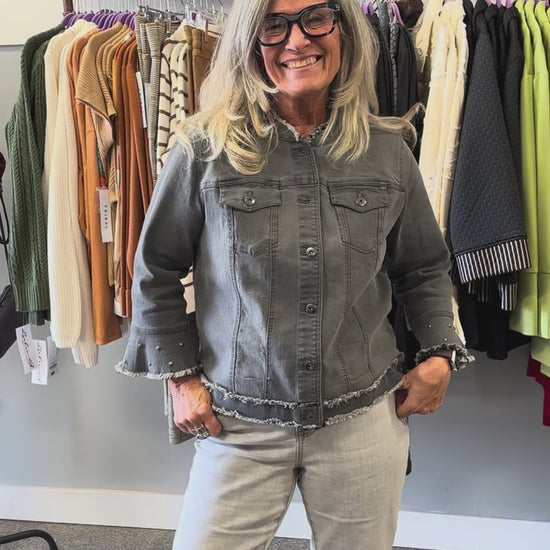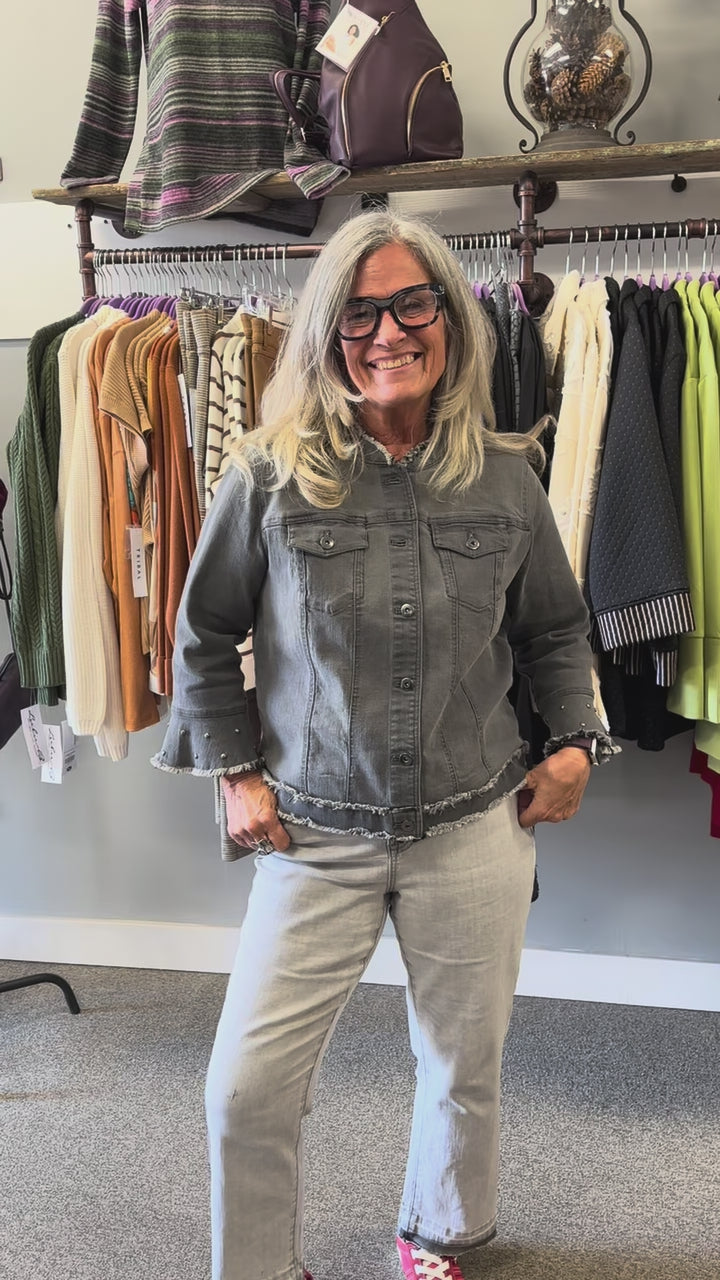 A playful spin on a denim classic, this slub jean jacket features flounced 3/4 sleeves with fringe detailing and subtle embellishments for a touch of sparkle. Designed with a stand collar, button front, and dual pockets, it blends structure with standout style.