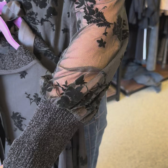 Elevated edge meets soft detail. Crafted from airy flocked mesh with velour ribbing, this sweatshirt plays with contrast—topped off by a bow-tied back that adds a playful, feminine finish.