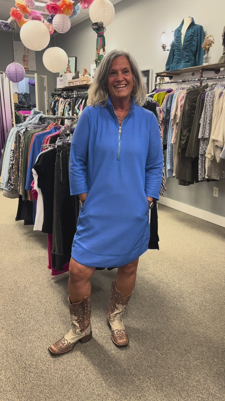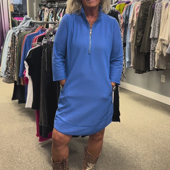 Comfy long-sleeve dress with pockets and a half zipper from the neck. Great with any type of shoe or boot.