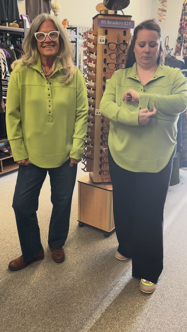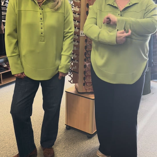 Stay cozy and stylish in this effortlessly cool pullover, designed in a refreshing citron hue. Featuring a mock neck collar with a bold snap-button half placket, it brings a sporty-chic vibe to your everyday look. The drop shoulder long sleeves provide a relaxed fit, while the wide cuffed ends add a touch of structure. Finished with a rounded high-low hemline, this pullover offers extra coverage and flattering shape—perfect for pairing with your favorite denim or leggings for a laid-back, polished ensemble.
