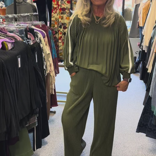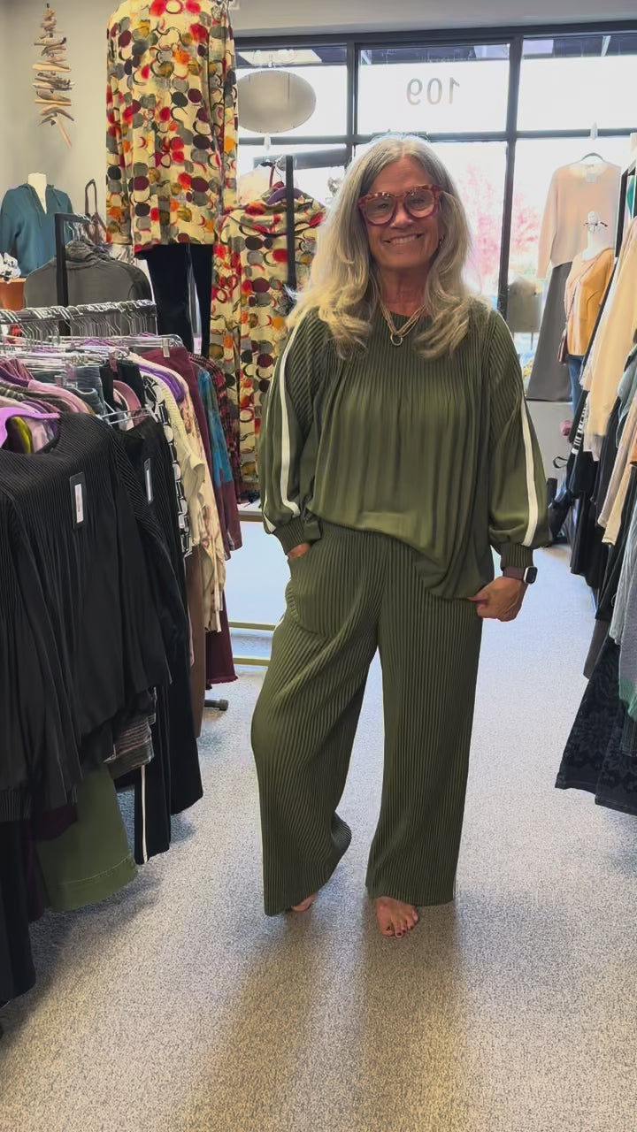 A cool and unique high waisted straight leg pant, made with high quality woven pleated material, is beautiful on with its contrast piping on the leg. Style with the Jaline Top for a perfect match.