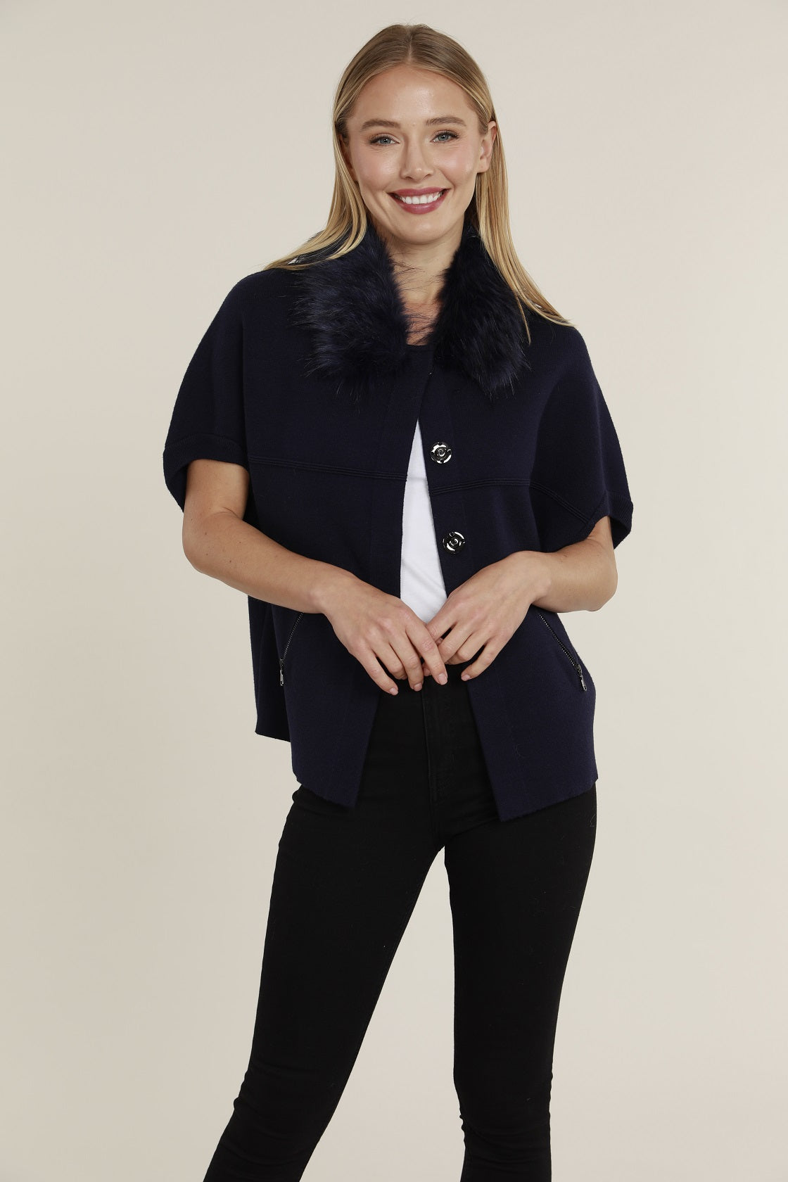 Drape yourself in the coziest comfort this fall with our Structured Short Sleeved Cardigan with Faux Fur Collar. Made of soft knit and featuring a plush collar, this unique piece adds cool sophistication to your casual outfits. It features front zip pockets, wide short sleeves, and snap closures for a secure fit. Perfect for layering, this structured cardigan is the ideal choice for chilly days, combining warmth and fashion effortlessly.