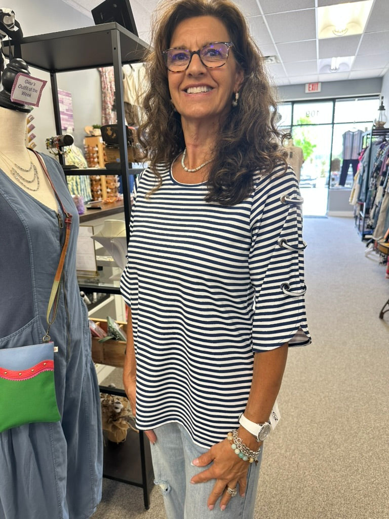 This top is adorable! Plain or striped, the 3/4 sleeve lays nicely on the arm with the grommet detail. Jazz up your pant, skirt or capri with this fun top.