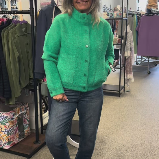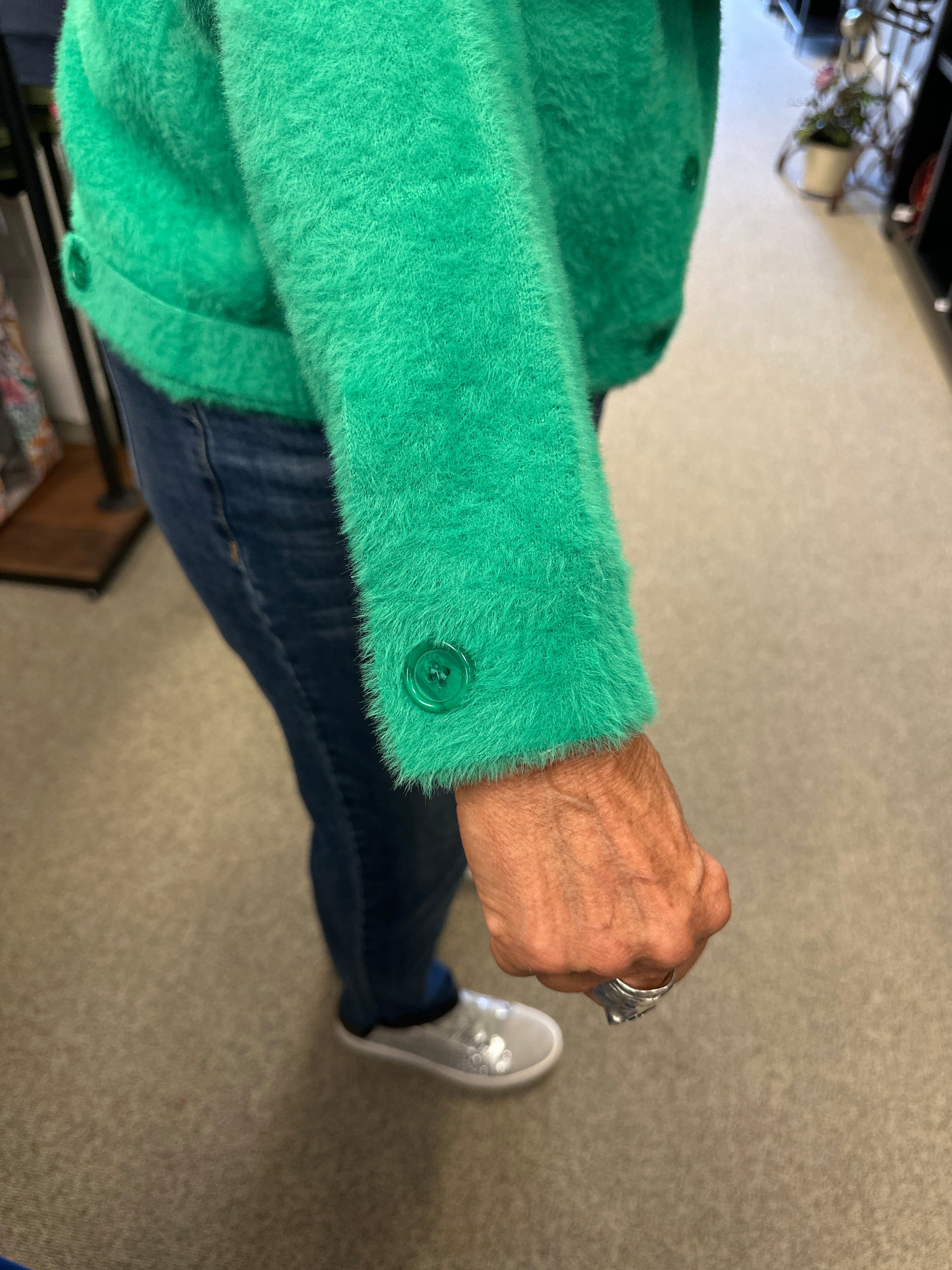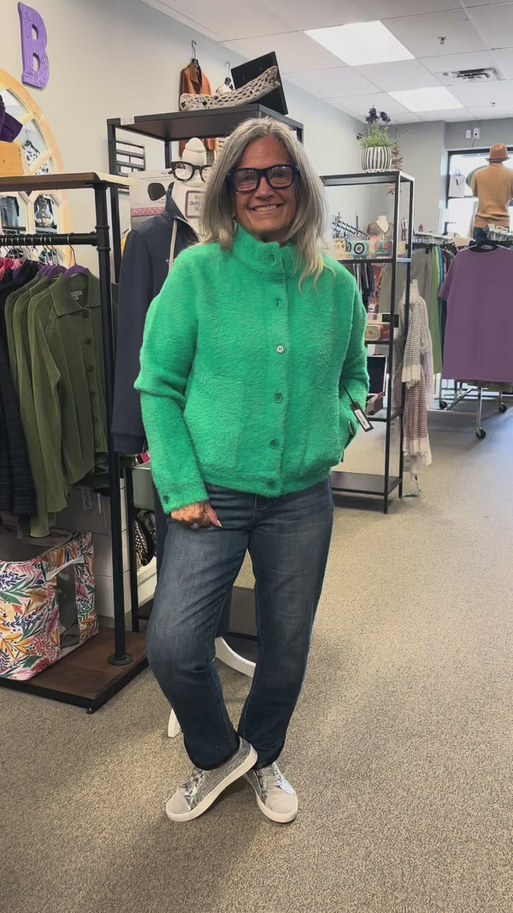 Cozy cropped patch pocket cardigan in a beautiful emerald, which seems to be the color of the year. It's warm and cozy with button detail at the wrist and on the side! You can wear this open, closed and over anything.