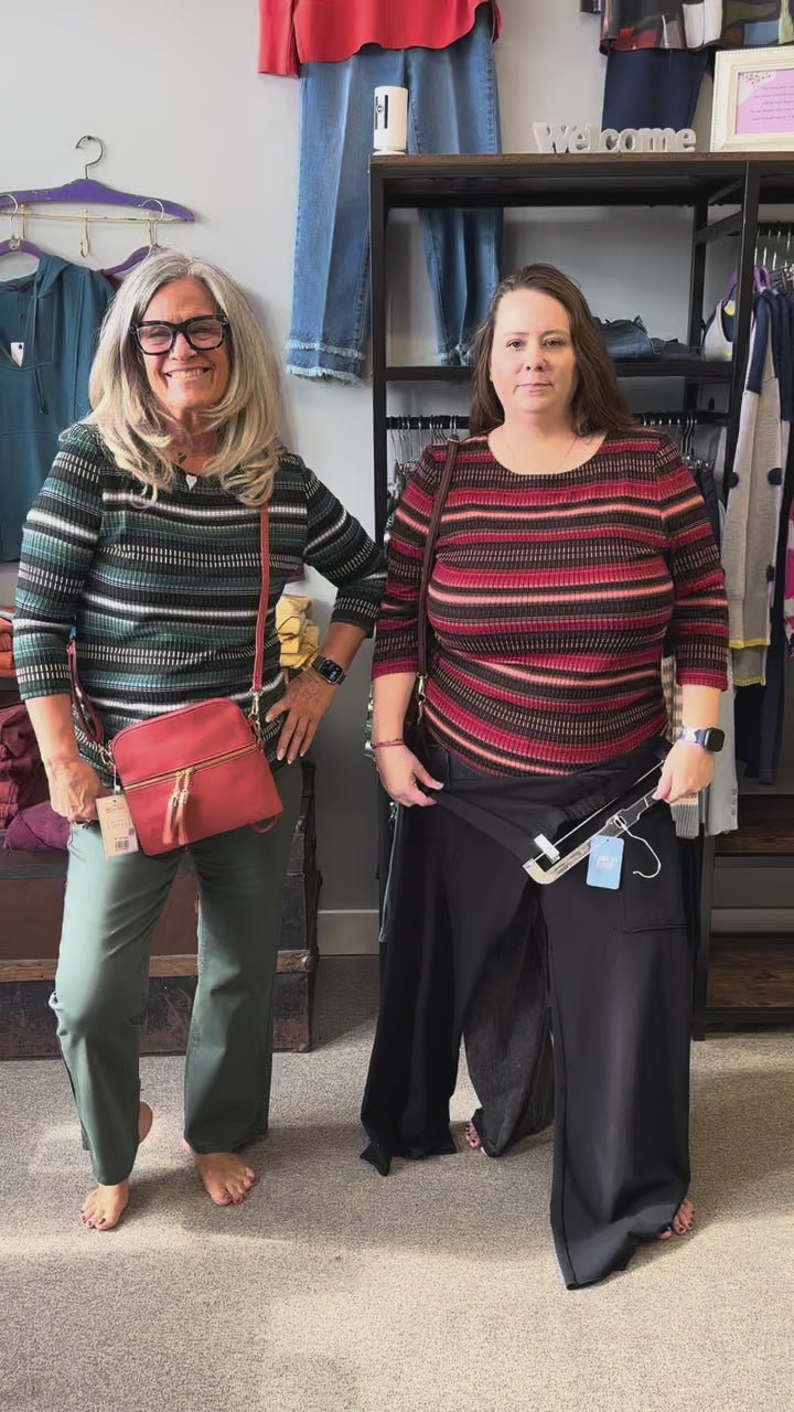 The perfect pull on pant, in black or stonewash, with an elastic waist that fits perfectly, wide leg and big pockets. Made in the USA and preshrunk.