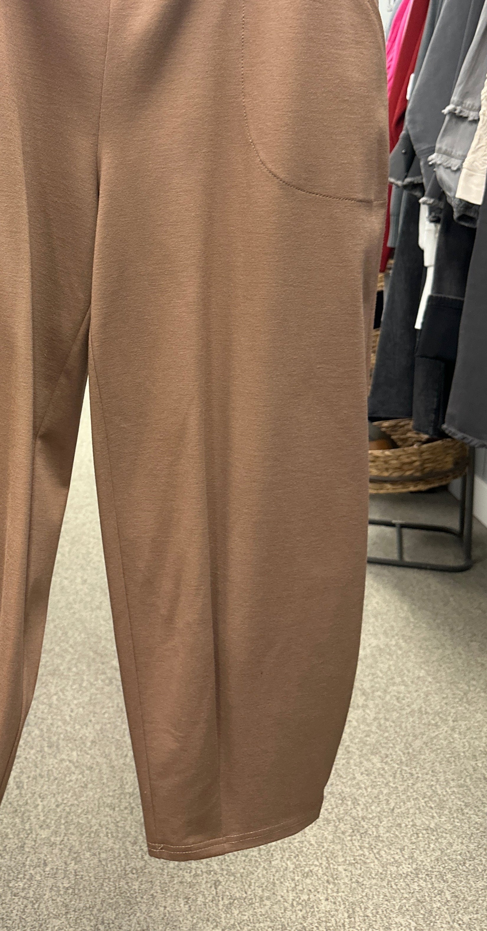 Comfort, fun style and adorable on. This barrel leg pant, with pockets, will go with any shoe, boot or your tennis shoes and anything in your closet.