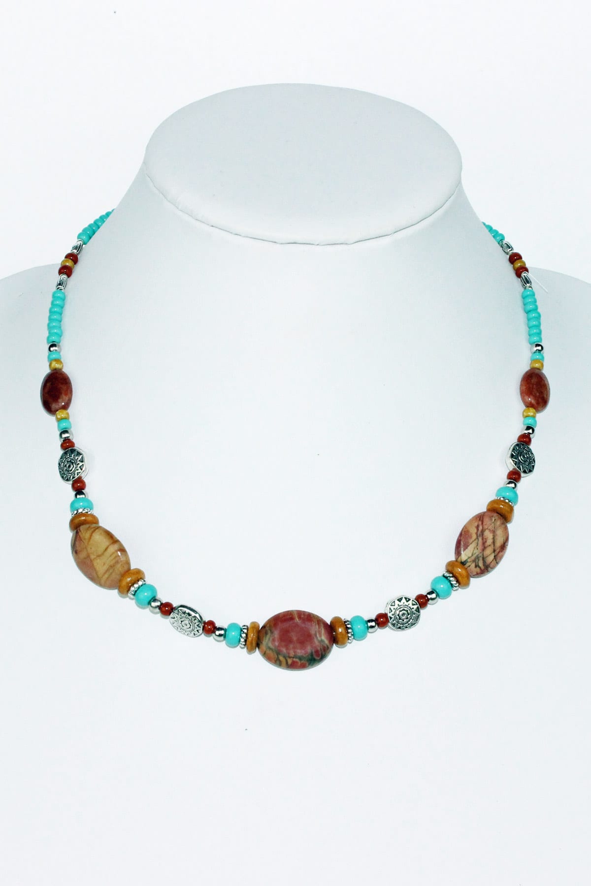 Handcrafted by artisans from the Black Hills of South Dakota, this necklace has various kinds of jasper, red, natural, turquoise and silver beads on a single strand. The protective energy of this stone is released slowly with every wearing. Each piece is unique and may vary slightly.