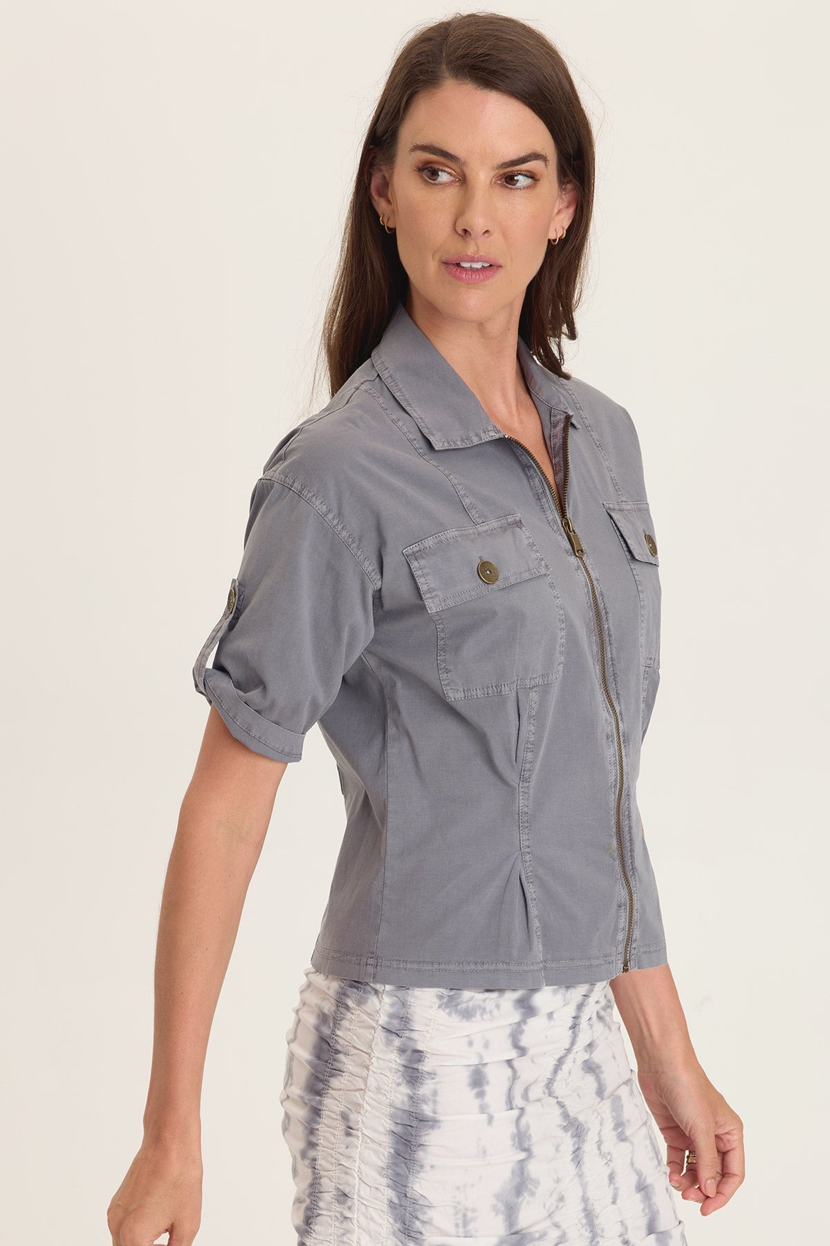 - Functional Design: Two breast pockets and tabbed sleeves add both style and practicality