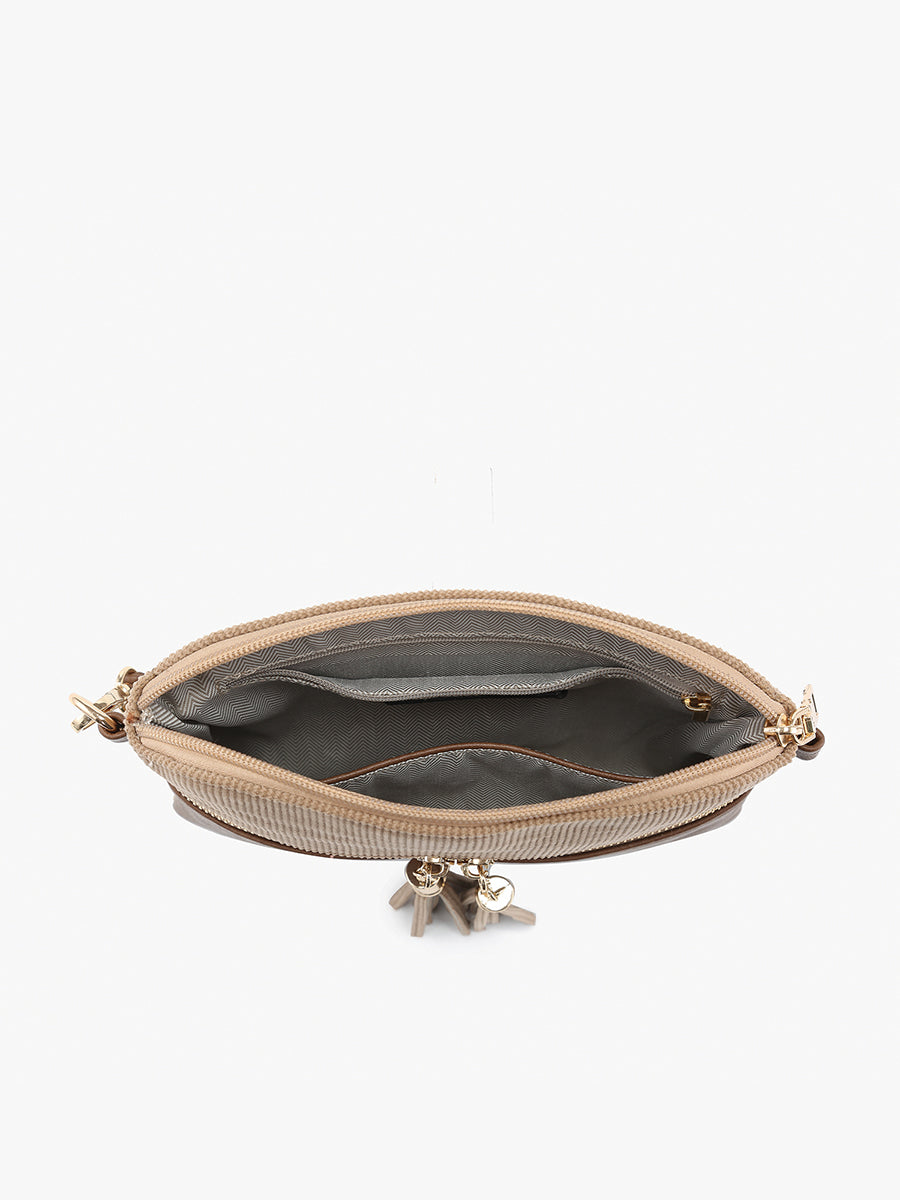 The Tara corduroy double zip crossbody/wristlet is a must-have for fall. This cozy style features cruelty-free vegan leather with soft corduroy and chic gold-tone hardware.