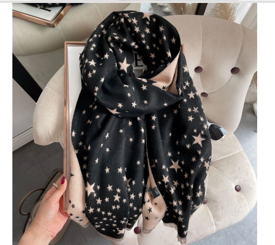 This adorable scarf, in black and tan, has adorable stars throughout. One side is black with small gold stars and the flip side is tan with black stars. Or, you can blend one side with the other.