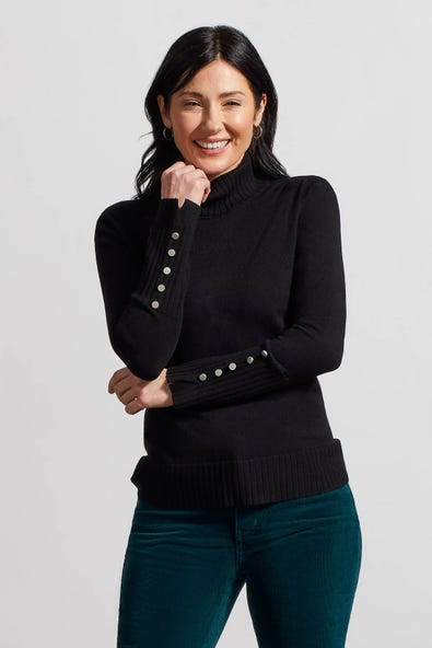 This sweater is hitting all the high notes with a polished turtleneck and metal button accents with a matte finish. We're infatuated with the pop-over design, knit blend fabric, long sleeves with button-adorned cuffs, close fit, and ribbed trim at the neck, cuffs, and hem.