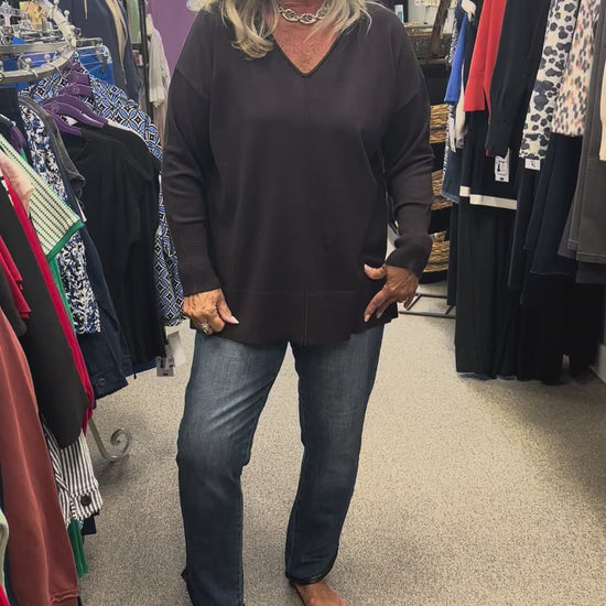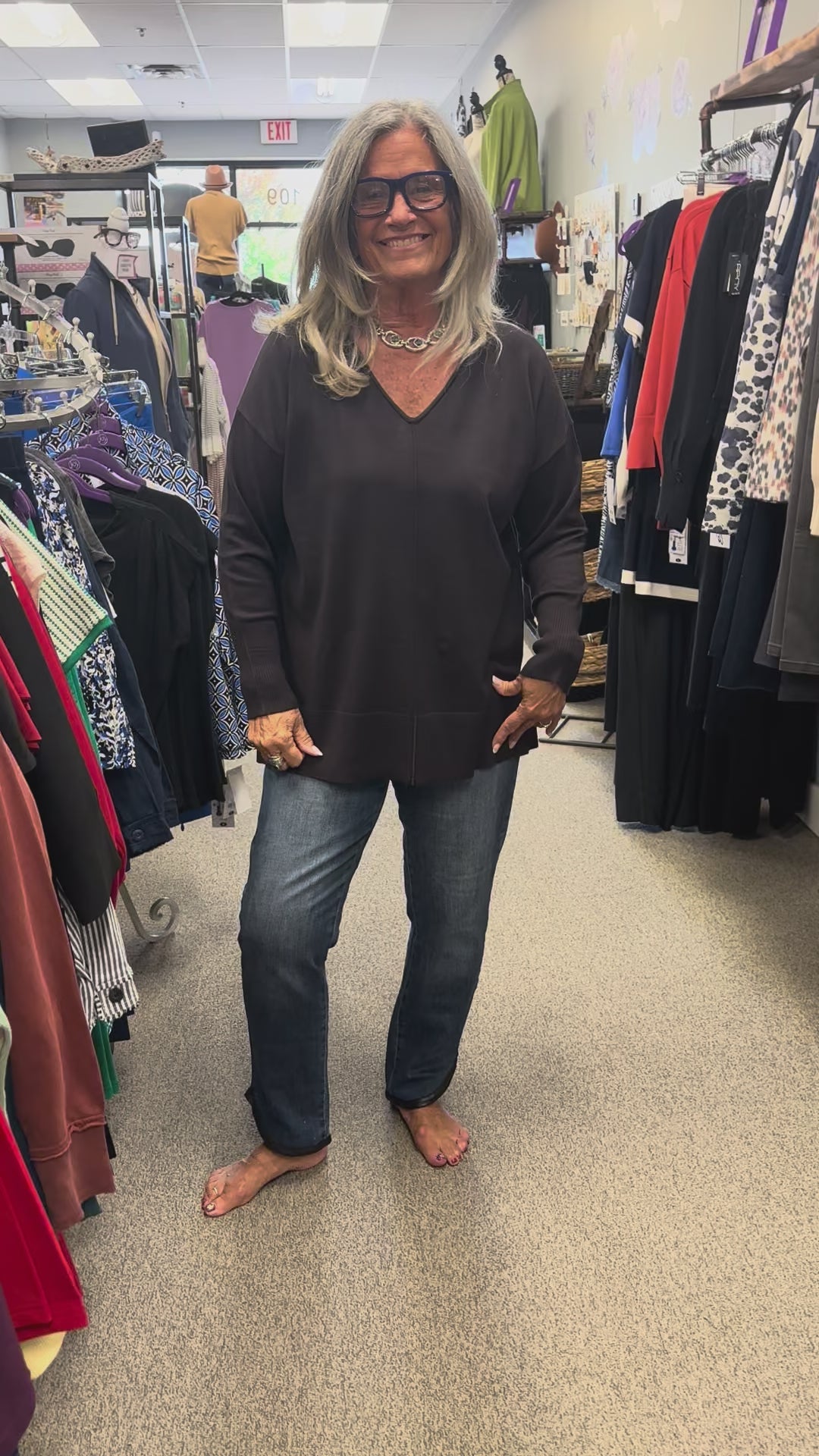 This is a must color for fall/winter. Chocolate brown, v-neck, lightweight, ribbed sleeve half way up the arm and the hemline, split on the side of hem and oh so comfortable.