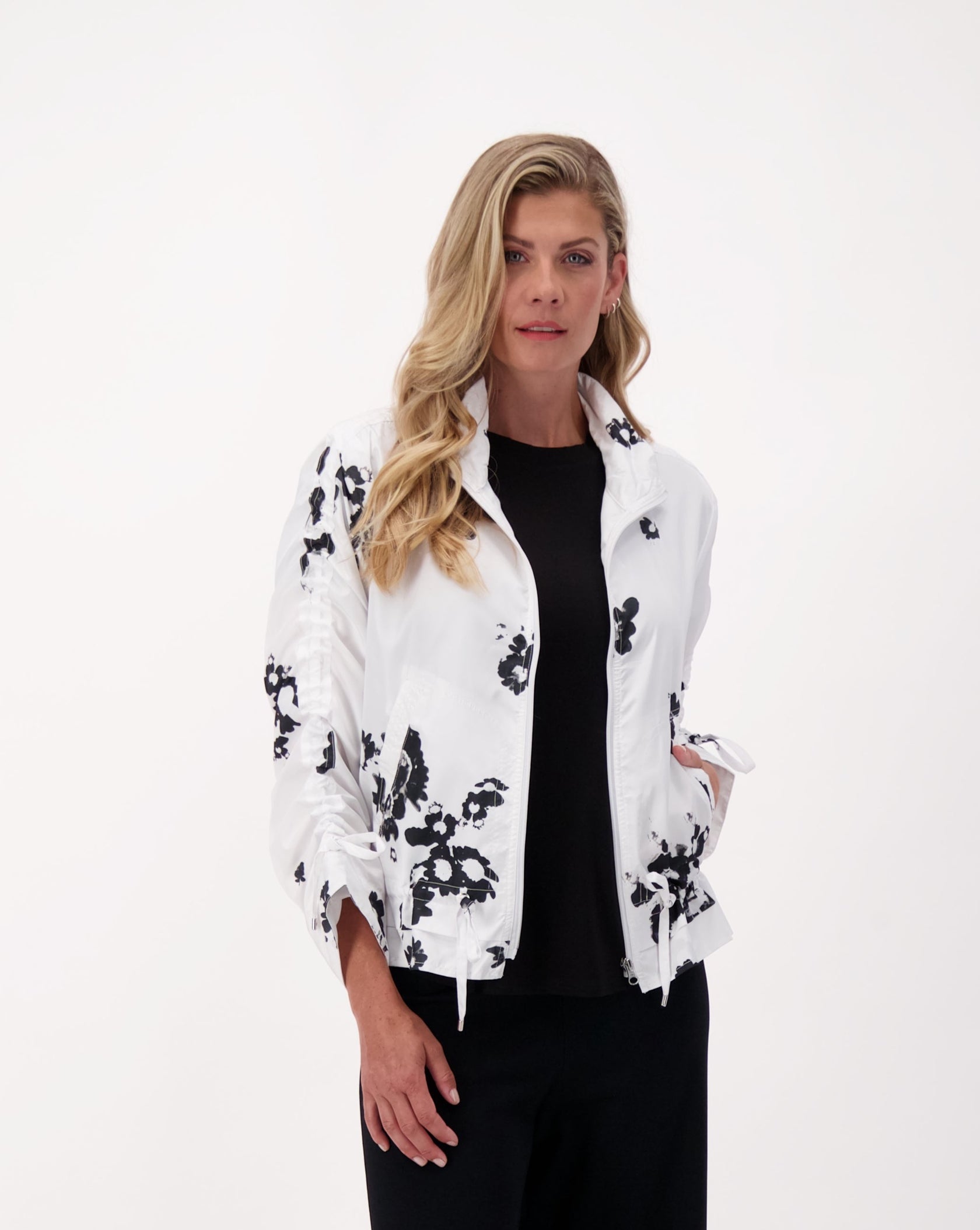 Lightweight water repellent stylish jacket with front zipper, ruching on the sleeve, adjustable ruching at the waistline and snap pockets. This will be easy to take anywhere in your purse or suitcase. Great to wear day or night and even in the rain.